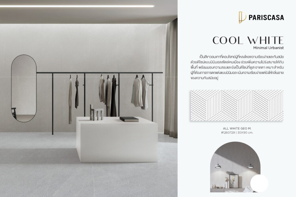 COOL WHITE — Minimal Urbanist เป็นสีขาวอมเทาที่ตอบโจทย์ผู้ที่หลงใหลความเรียบง่ายและทันสมัย ด้วยดีไซน์แบบมินิมอลสไตล์คนเมือง ช่วยเพิ่มความโปร่งสบายให้กับพื้นที่ พร้อมมอบความสงบและยังเป็นดีไซน์ที่ดูสะอาดตา เหมาะสำหรับการตกแต่งแบบมินิมอล เน้นความเรียบง่าย แฝงด้วยกลิ่นอายของความทันสมัย