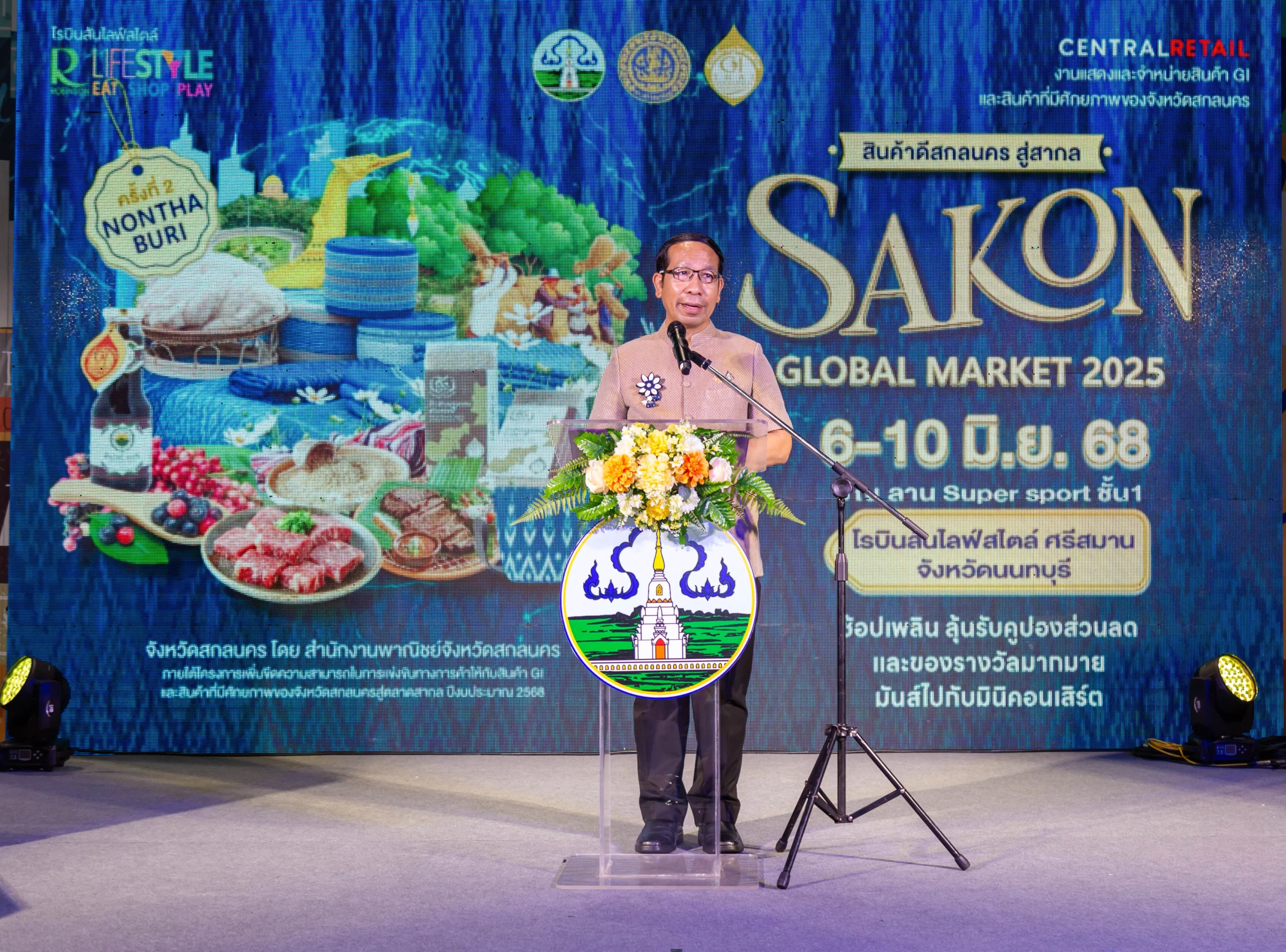 การจัดงานมหกรรมแสดงและจำหน่ายสินค้า GI และสินค้าที่มีศักยภาพของจังหวัดสกลนคร ภายใต้ ชื่องาน “สินค้าดี สกลนคร สู่สากล SAKON Global Market 2025 ” ในครั้งนี้ จัดขึ้นระหว่างวันที่ 6-10 มิถุนายน 2568 ณ ลาน Super sport ชั้น 1 โรบินสัน ไลฟ์สไตล์ ศรีสมาน อ.ปากเกร็ด จ.นนทบุรี โดยมีผู้ประกอบการจากจังหวัด สกลนคร เข้าร่วมงานแสดงและจำหน่ายสินค้า จำนวน 50 คูหา กิจกรรมการแสดงจากศิลปิน -REX ศิลปิน บิว กัลยาณี การแสดงศิลปวัฒนธรรม การเดินแฟชั่นโชว์ Kram Couture : Local to Global และกิจกรรมส่งเสริมการขาย แชะ แชร์ โชว์, นาทีทอง ,จับรางวัลลุ้นโชค ทุกวัน