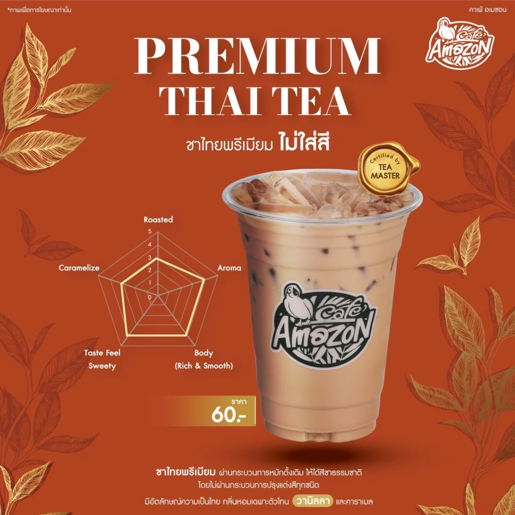 “ชาไทยพรีเมียม ไม่ใส่สี” จาก คาเฟ่ อเมซอน พัฒนาสูตรเฉพาะโดยความร่วมมือกับ Tea Lab สิงห์ปาร์ค คัดสรรใบชาอัสสัมจากจังหวัดน่าน ผ่านการเบลนด์สูตรพิเศษโดยผู้เชี่ยวชาญด้านชา หรือ Tea Master จนได้ออกมาเป็นชาไทยพรีเมียม ที่คงรสชาติเข้มข้น หอมละมุน ผ่านกรรมวิธีหมักชาโดยไม่แต่งสีทุกชนิด เพื่อให้ได้ชารสชาติที่มีอัตลักษณ์เฉพาะตัว