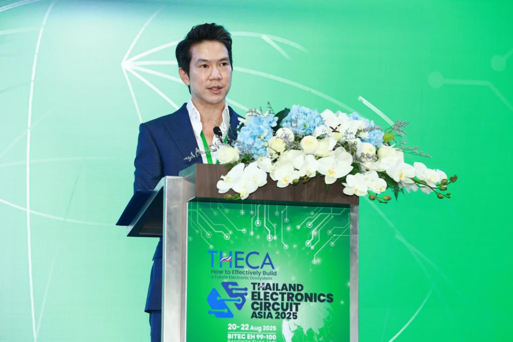 นายนฤตม์ เทอดสถีรศักดิ์ เลขาธิการคณะกรรมการส่งเสริมการลงทุน (บีโอไอ) เจ้าภาพการจัดงานเปิดเผยว่า THECA 2025 ไม่ใช่เพียงงานแสดงสินค้า แต่คือสัญลักษณ์แห่งการเปลี่ยนผ่านของประเทศไทยจากบทบาทการเป็นฐานการผลิตไปสู่ “ผู้นำระบบนิเวศอิเล็กทรอนิกส์” ที่ครบวงจรที่สุดในภูมิภาค โดยบีโอไอได้กำหนดยุทธศาสตร์ส่งเสริมการลงทุนที่ครอบคลุม ตั้งแต่มาตรการสิทธิประโยชน์ที่เหมาะสม การส่งเสริมการพัฒนาโครงสร้างพื้นฐาน การพัฒนาเทคโนโลยีและนวัตกรรม การเพิ่มทักษะฝีมือบุคลากร ไปจนถึงการสร้างเครือข่ายเชื่อมโยงระดับโลก ตั้งแต่ปี 2565 – มิถุนายน 2568 มีคำขอรับการส่งเสริมการลงทุนในอุตสาหกรรมเซมิคอนดักเตอร์และอิเล็กทรอนิกส์ขั้นสูง เช่น การออกแบบชิป การประกอบชิป การทดสอบเวเฟอร์และแผ่นวงจรรวม การผลิต PCB ไปจนถึงการผลิตเครื่องใช้ไฟฟ้าอัจฉริยะและอุปกรณ์อิเล็กทรอนิกส์ รวม 517 โครงการ มูลค่าเงินลงทุนกว่า7 แสนล้านบาท โดยมีนักลงทุนหลักจากเยอรมัน สหรัฐอเมริกา จีน ไต้หวัน ญี่ปุ่น เกาหลีใต้ และฮ่องกงโดยเป็นการลงทุนอุตสาหกรรม PCB 180 โครงการ มูลค่ารวมกว่า 2 แสนล้านบาท ซึ่งจะทำให้ไทยครองตำแหน่งผู้ผลิต PCB อันดับ 1 ของอาเซียน และติดอันดับ 1 ใน 5 ของโลกในการจัดงานครั้งนี้ บีโอไอ จัดเวที BOI Forum ภายใต้แนวคิด “Building the Future: Investment Policies Shaping Thailand’s Advanced Electronics and Semiconductor Ecosystem” โดยมีเป้าหมายเพื่อรวมพลังของทุกภาคส่วนในระบบนิเวศ ตั้งแต่การออกแบบวงจรรวม (IC), การผลิตและทดสอบเวเฟอร์,การผลิต PCB, การผลิตชิ้นส่วนอิเล็กทรอนิกส์ต่าง ๆ (EMS) ไปจนถึงการประกอบและทดสอบวงจรรวม (IC Packaging and Test) เข้าด้วยกันอย่างครบวงจร โดยเฉพาะในอุตสาหกรรม PCB ไทย ที่กำลังยกระดับจากผู้ผลิต PCB ชนิดทั่วไป สู่การเป็นผู้พัฒนา PCB ขั้นสูง เช่น HDI PCB, Flexible PCB หรือ Multilayer PCB ที่สามารถรองรับอุตสาหกรรมเทคโนโลยีระดับสูง โดยเฉพาะเทคโนโลยี AI