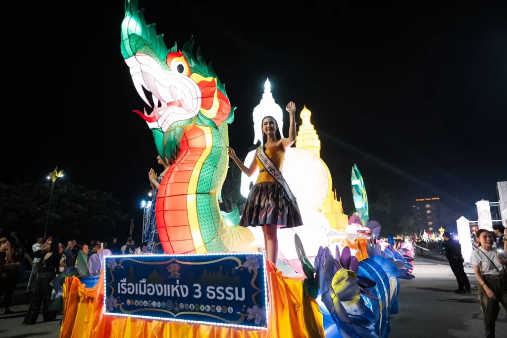 เวลา 19.30 น. ณ บริเวณหน้าวัดพระอินทร์แปลง ตำบลในเมือง อำเภอเมืองนครพนม นายปราชญา อุ่นเพชรวรากร ผู้ว่าราชการจังหวัดนครพนม พร้อมด้วย นางธนวัน อุ่นเพชรวรากร นายกเหล่ากาชาดจังหวัดนครพนม รองผู้ว่าราชการจังหวัดนครพนม หัวหน้าส่วนราชการ และประชาชน ทำพิธีปล่อยขบวนเรือไฟบกอนุภาคลุ่มแม่น้ำโขง “Nakhon Phanom illuminated Boat Carnival” จำนวน 9 ขบวน พร้อมผู้ร่วมขบวนอีกมากมายกว่า 900 ชีวิต ประกอบไปด้วย เรือไฟเอกลักษณ์สาธารณรัฐประชาชนจีน เรือมังกรแห่งปัญญา เรือไฟเอกลักษณ์สาธารณรัฐสังคมนิยมเวียดนาม เรือรุ่งอรุณแห่งเวียดนาม เรือไฟเอกลักษณ์สาธารณรัฐประชาธิปไตยประชาชนลาว เรือสายน้ำแห่งมิตรภาพ เรือไฟเอกลักษณ์กลุ่มจังหวัดสนุก จังหวัดสกลนคร เรือครามแห่งศรัทธา เรือไฟเอกลักษณ์กลุ่มจังหวัดสนุก จังหวัดมุกดาหาร เรือมุกสะพานศิลป์ เรือไฟเอกลักษณ์กลุ่มจังหวัดสนุก จังหวัดนครพนม ได้แก่ เรือศรัทธามหานที เรือสายใยชนเผ่า เรือสายสัมพันธ์วัฒนธรรม และปิดท้ายด้วย เรือไฟขบวนแฟนซีไฟเรืองแสง ม่วนซื่นอีสาน ประดับด้วยแสงไฟ ที่งดงามตระการตาและสร้างความประทับใจแก่นักท่องเที่ยวเป็นอย่างมาก นอกจากนี้ ยังมีการแสดงแสง สี เสียง สื่อผสมประกอบม่านน้ำ พลุรักษ์โลก งานประเพณีไหลเรือไฟนครพนม ๑ เดียวในโลก “แสงไฟแห่งศรัทธา”