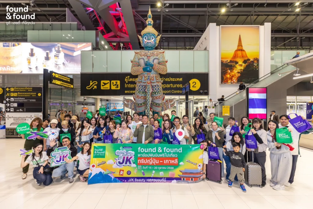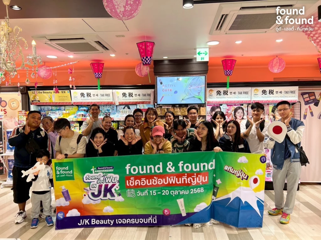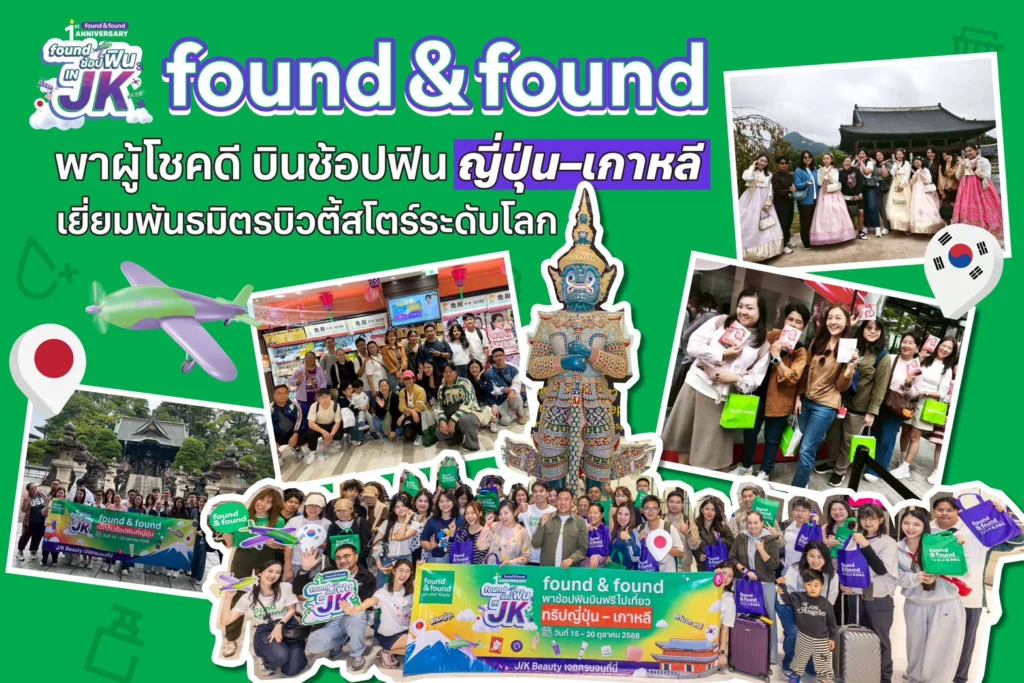 “found & found” ตอกย้ำภาพลักษณ์แบรนด์บิวตี้รีเทลยุคใหม่ จัดกิจกรรมสุดเอ็กซ์คลูซีฟ “found ช้อปฟิน IN JK” ฉลองครบรอบ 1 ปี ด้วยการพาผู้โชคดีจากแคมเปญบินลัดฟ้าไปเช็กอิน 2 เมืองแห่งอุตสาหกรรมความงามระดับโลก โตเกียว และโซล สัมผัสแรงบันดาลใจจากแหล่งกำเนิดเทรนด์บิวตี้ญี่ปุ่น–เกาหลี พร้อมเยี่ยมชมพันธมิตรทางธุรกิจ SUGI Holdings และ CJ Olive Young อย่างใกล้ชิด