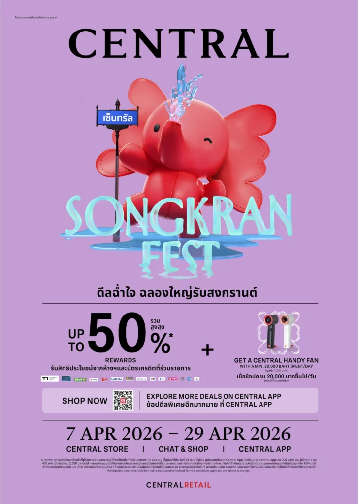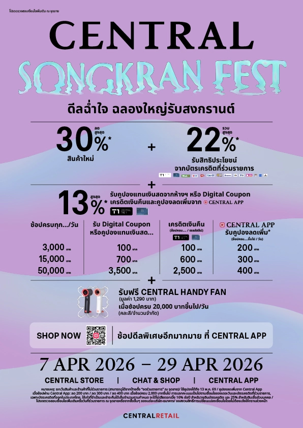 ชวนอัปเดตเทรนด์หน้าร้อนและสนุกกับการช้อปในแคมเปญ “CENTRAL SONGKRAN FEST” ตั้งแต่วันที่ 7–29 เมษายน 2569 ที่คัดสรรสินค้าใหม่ คอลเลกชันล่าสุด และไอเทมเด่นจากหมวดบิวตี้และแฟชั่น พร้อมข้อเสนอพิเศษตลอดแคมเปญ และเพลิดเพลินไปกับกิจกรรมสงกรานต์ที่ช่วยเติมบรรยากาศแห่งความสุขของทุกครอบครัว ได้ที่ห้างเซ็นทรัลทุกสาขา เซ็นทรัลแอป และทุกช่องทางการช้อป ทั้งเว็บไซต์ www.central.co.th, Central Chat & Shop ช้อปและแชตผ่านไลน์ @Centralofficial รวมถึงช้อปผ่านเฟซบุ๊กที่ Facebook page: Central Department Store