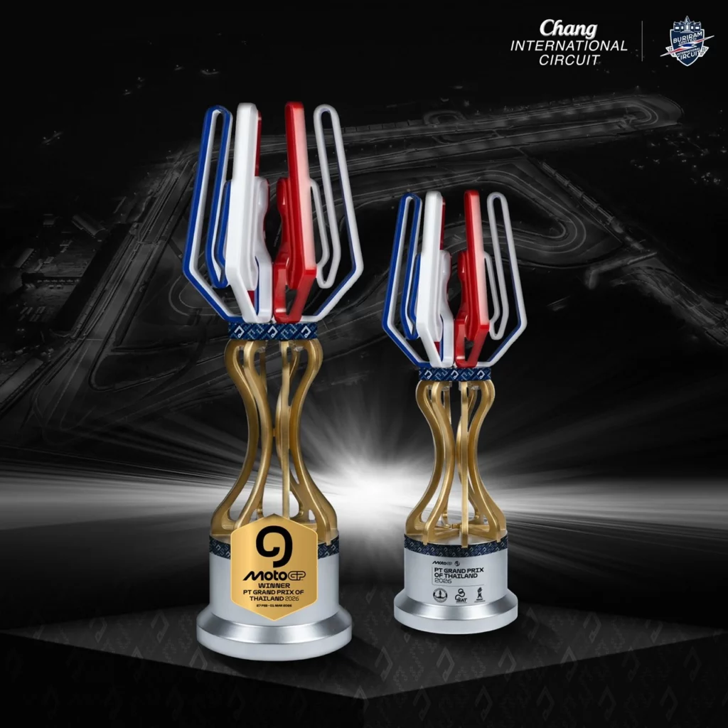 ภายในงานแถลงข่าว ยังมีการเปิดตัว ถ้วยรางวัลโมโตจีพี สนามประเทศไทย ประจำปี 2026 อย่างเป็นทางการ ซึ่งนับเป็นอีกหนึ่งไฮไลต์สำคัญของฤดูกาล งานออกแบบถ่ายทอดเรื่องราวและอัตลักษณ์ของประเทศไทยในฐานะ “สนามเปิดฤดูกาล” ของศึกสองล้อระดับโลก โดยแนวคิดหลักเปรียบเสมือน การจุดคบเพลิงแห่งการเริ่มต้น จากสนามแรกคือประเทศไทยไปสู่ทั้งฤดูกาล MotoGP 2026