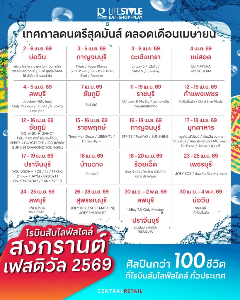 ศูนย์การค้าโรบินสันไลฟ์สไตล์ ในเครือเซ็นทรัล รีเทล ต้อนรับเทศกาลสงกรานต์ด้วยงาน “Summer Fest – Songkran Festival 2569” เทศกาลดนตรีและความบันเทิงครั้งใหญ่ทั่วไทย ที่เตรียมยกทัพศิลปินกว่า 100 ชีวิต มาร่วมสร้างสีสันและความสนุกตลอดเดือนเมษายน 2569 ณ โรบินสันไลฟ์สไตล์ ทั่วประเทศ เพื่อร่วมเฉลิมฉลองเทศกาลปีใหม่ไทยซึ่งเป็นช่วงเวลาแห่งความสุขของครอบครัว การกลับมาพบปะกันของคนใกล้ชิด และโมเมนต์แห่งความประทับใจที่มีความหมาย โดยโรบินสันไลฟ์สไตล์ยังคงตอกย้ำบทบาทในฐานะ “Central to Life” ศูนย์กลางชีวิตของทุกคน ผ่านการคัดสรรอิเวนต์ที่ตอบโจทย์ไลฟ์สไตล์อันหลากหลายของคนทุกเจเนเรชัน ทั้งสายดนตรี สายบันเทิง สายกิน และสายช้อป รวมไปถึงกลุ่มครอบครัวที่มองหาพื้นที่สำหรับพักผ่อนและใช้เวลาร่วมกันได้อย่างลงตัว พร้อมเนรมิตแต่ละสาขาให้กลายเป็นจุดหมายแห่งการเฉลิมฉลองที่เต็มไปด้วยบรรยากาศแห่งความสุข ความคึกคัก และประสบการณ์ความบันเทิงที่หลากหลาย ครอบคลุมทั้งแนวป๊อป ร็อก ฮิปฮอป ลูกทุ่ง ดีเจ และการแสดงสดอีกมากมาย ชวนทุกคนให้ออกมาร่วมสนุกและสัมผัสสีสันของสงกรานต์อย่างเต็มอิ่มตลอดทั้งเดือน