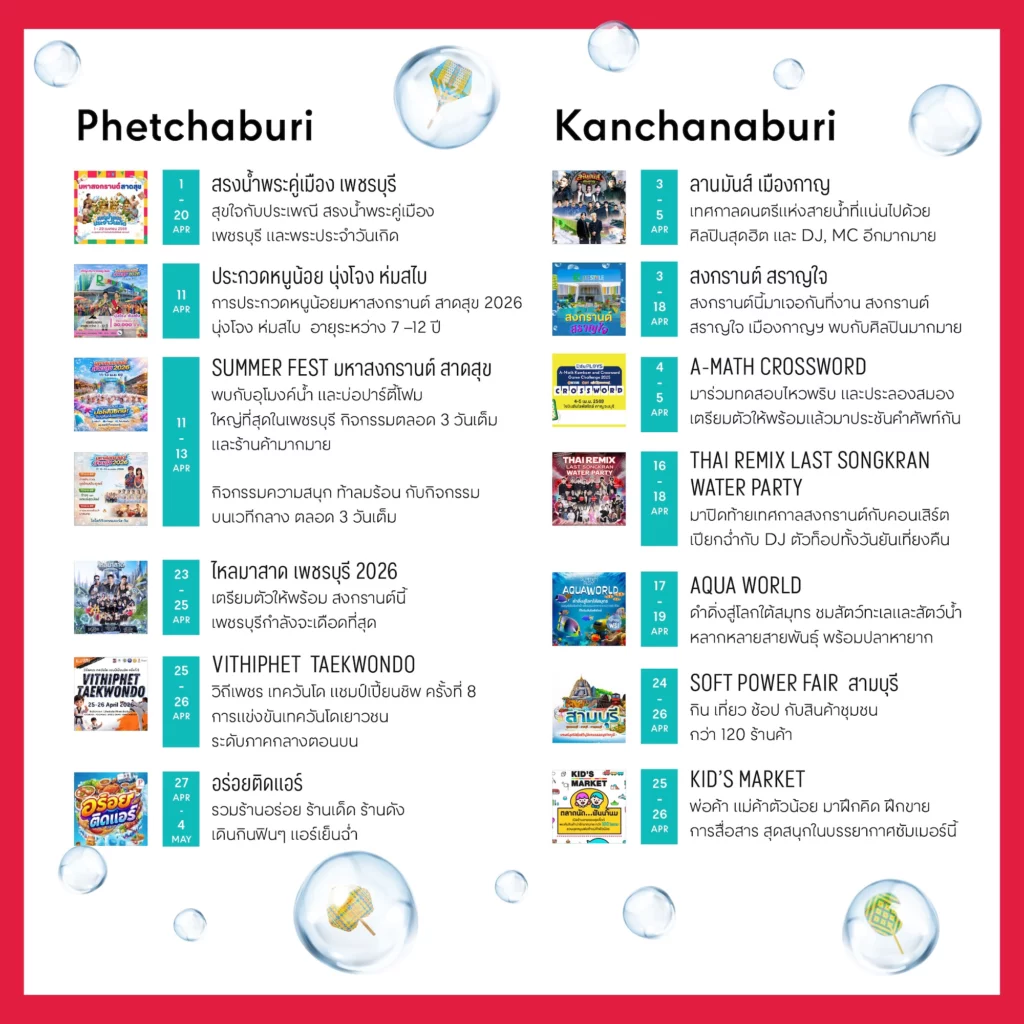 6 เม.ย. 69 – 12 เม.ย. 69​ร่วมสืบสานประเพณีไทยในกิจกรรม สงกรานต์เย็นใจ สรงน้ำพระไทย ร่วมรับพรชัยรับสงกรานต์ เติมความร่มเย็นให้ทุกคน ต้อนรับปีใหม่ไทยอย่างงดงาม