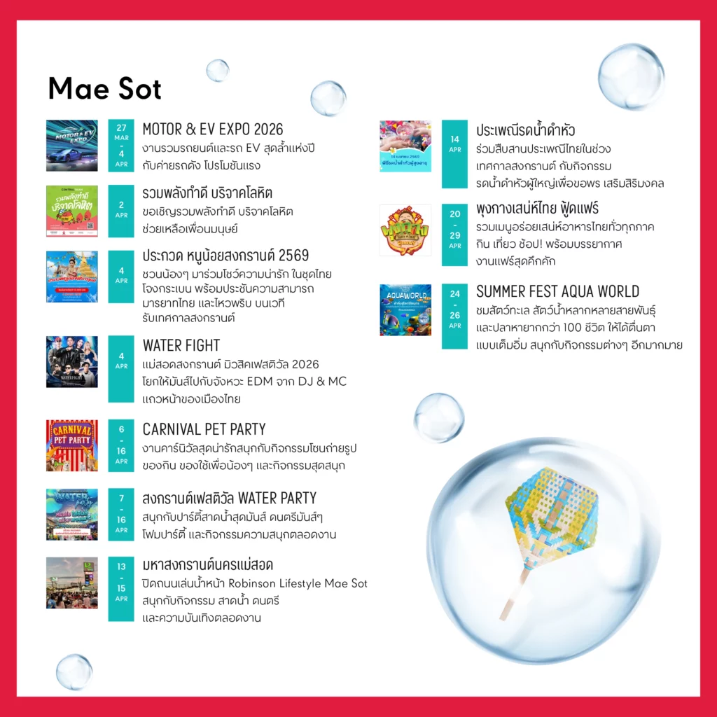 13 เม.ย. 69 – 15 เม.ย. 69​มาสาดความมันส์รับสงกรานต์กับ มหาสงกรานต์นครแม่สอด ปิดถนนเล่นน้ำกันอย่างเต็มที่บริเวณด้านหน้า โรบินสันไลฟ์สไตล์ แม่สอด สนุกกับกิจกรรม ดนตรี และความบันเทิงที่สร้างสีสันตลอดทั้งงาน