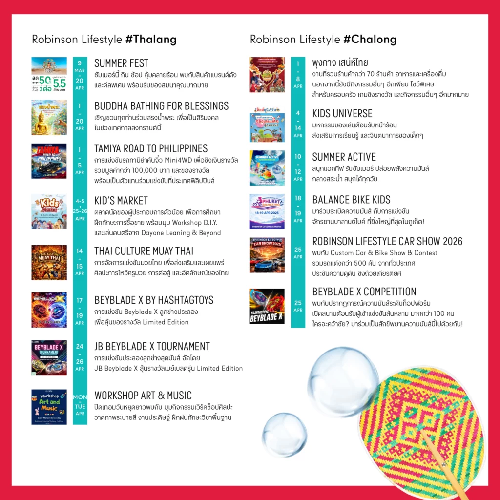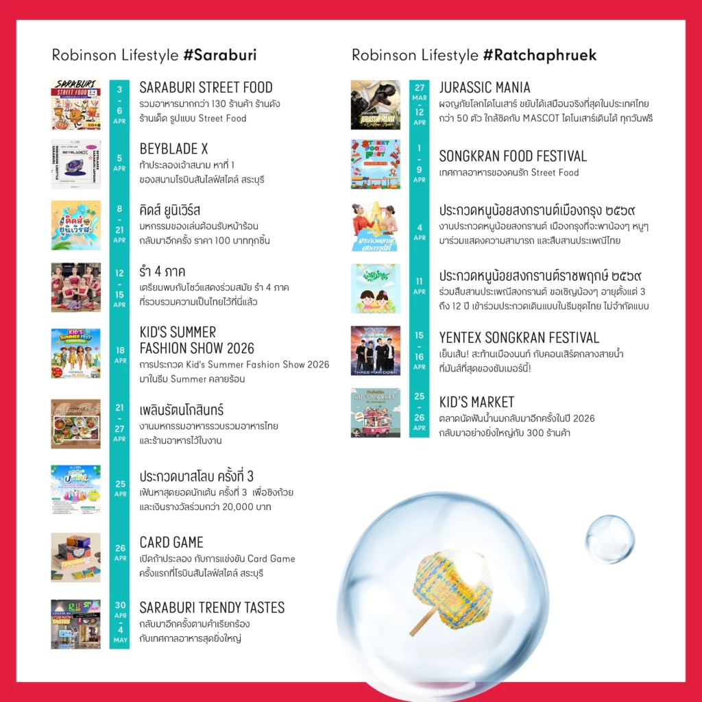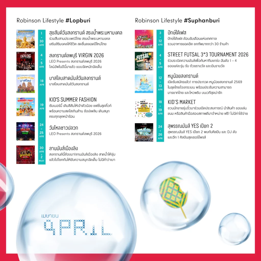 ขอเชิญชวนทุกคนออกมาใช้เวลาร่วมกันในช่วงเทศกาลสงกรานต์ เริ่มต้นปีใหม่ไทยด้วยความเป็นสิริมงคล และความสุขสนุกสนาน เติมเต็มวันพักผ่อนให้พิเศษกว่าที่เคย ทั้งกับครอบครัว คนรัก และเพื่อน ๆ พร้อมสัมผัสสีสันความสนุกตลอดเดือนภายใต้ธีม “Let’s Celebrate Songkran Fest” ตลอดเดือนเมษายน 2569 ที่ศูนย์การค้าโรบินสันไลฟ์สไตล์ทุกสาขาทั่วประเทศ