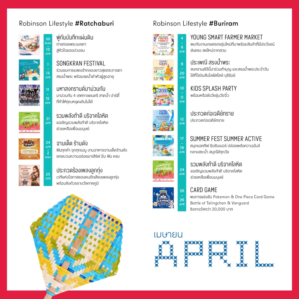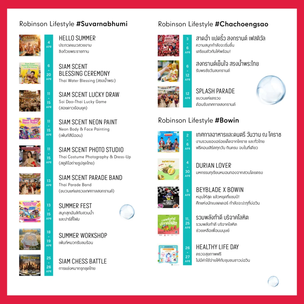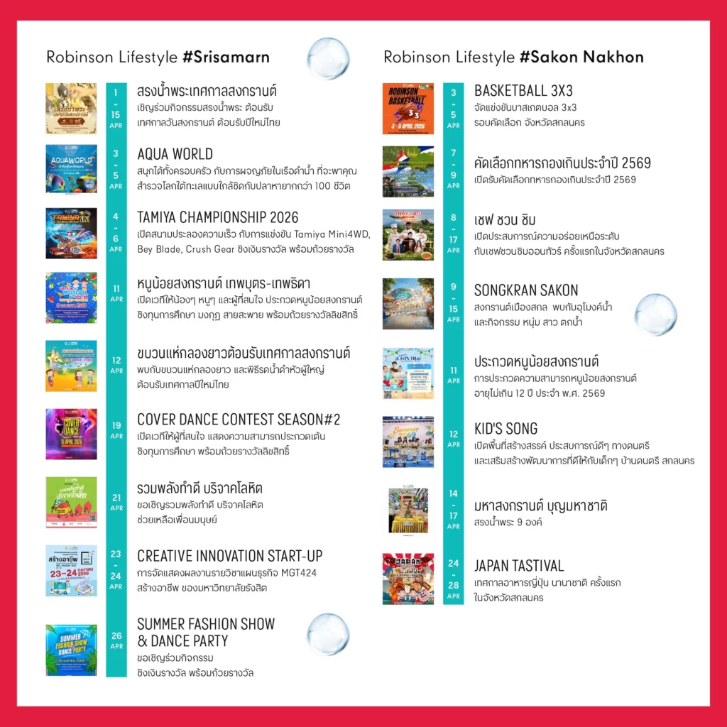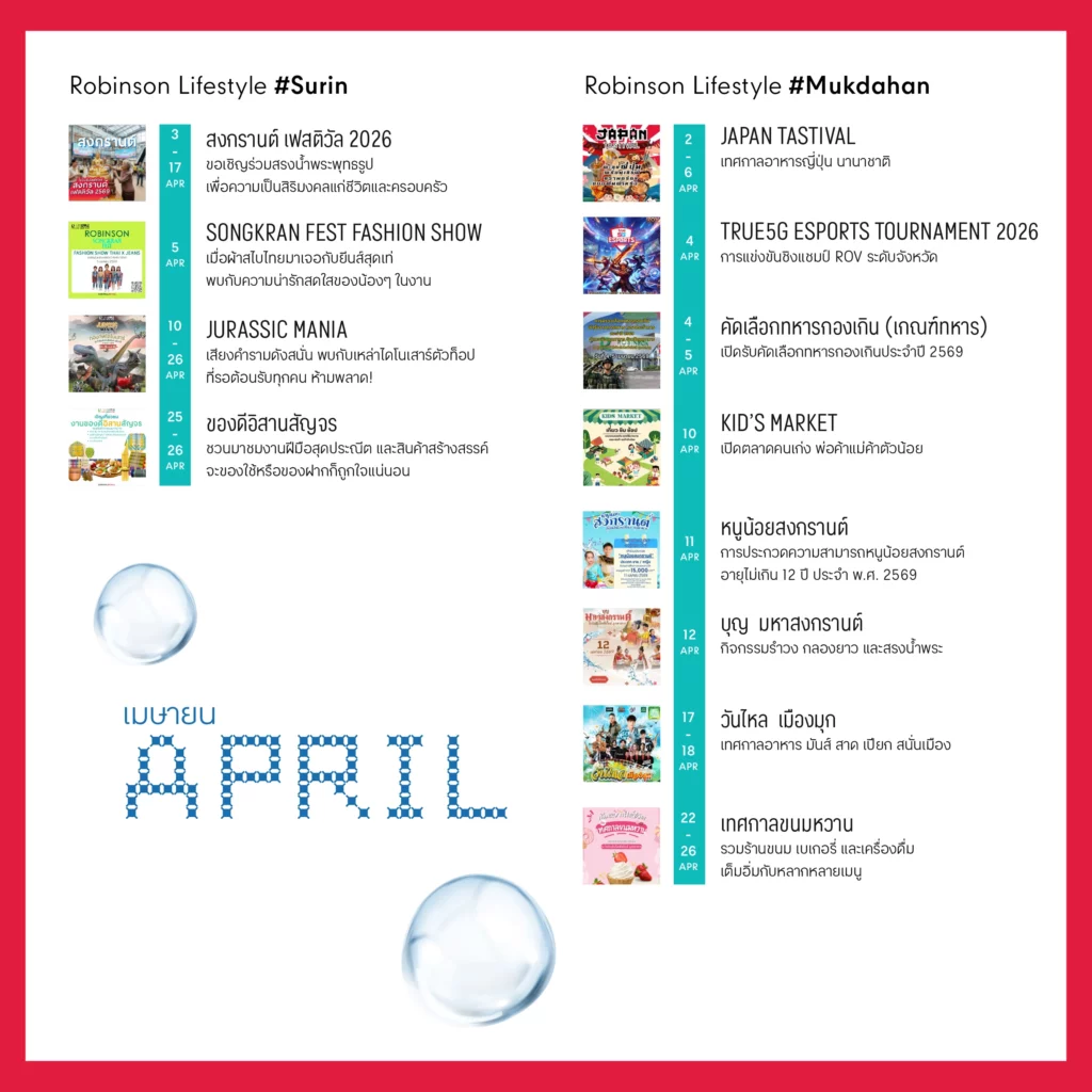 ขอเชิญชวนทุกคนออกมาใช้เวลาร่วมกันในช่วงเทศกาลสงกรานต์ เริ่มต้นปีใหม่ไทยด้วยความเป็นสิริมงคล และความสุขสนุกสนาน เติมเต็มวันพักผ่อนให้พิเศษกว่าที่เคย ทั้งกับครอบครัว คนรัก และเพื่อน ๆ พร้อมสัมผัสสีสันความสนุกตลอดเดือนภายใต้ธีม “Let’s Celebrate Songkran Fest” ตลอดเดือนเมษายน 2569 ที่ศูนย์การค้าโรบินสันไลฟ์สไตล์ทุกสาขาทั่วประเทศ