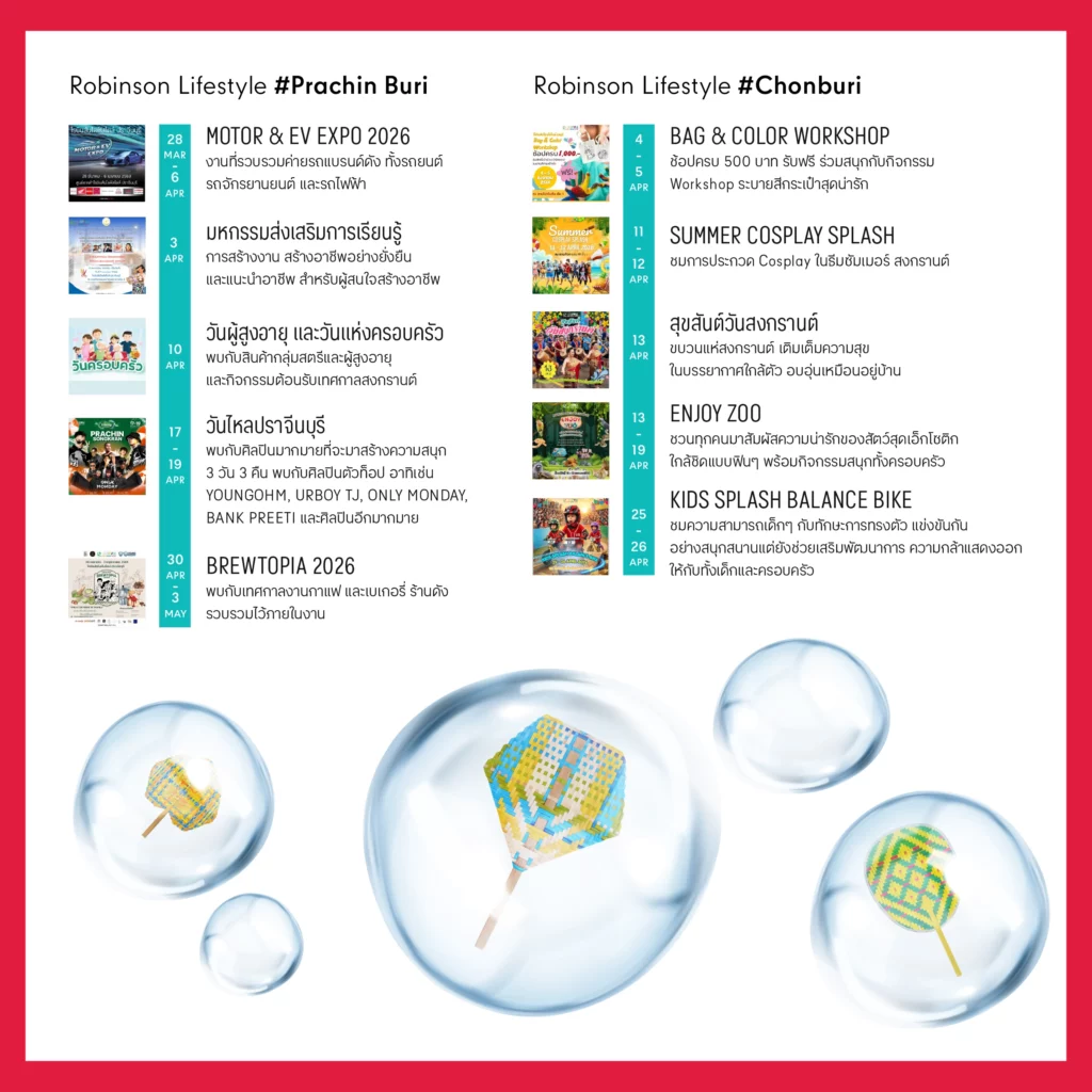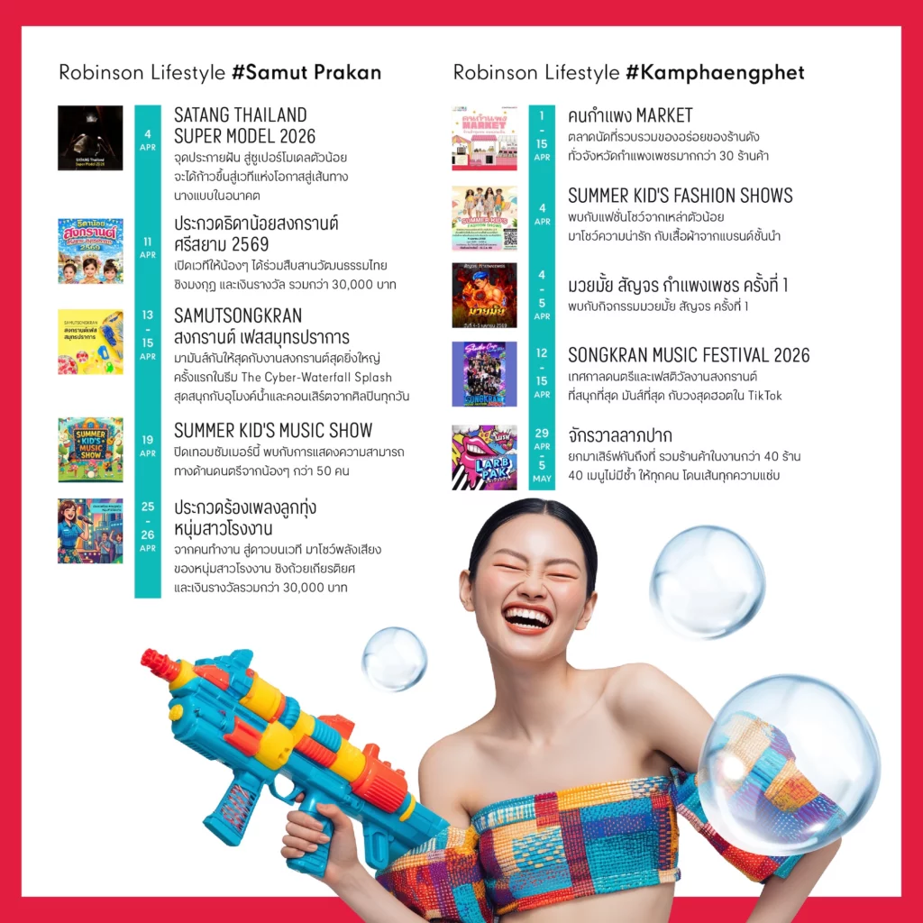 ศูนย์การค้าโรบินสันไลฟ์สไตล์ ในเครือเซ็นทรัล รีเทล ตอกย้ำแนวคิด “Central to Life” ศูนย์กลางชีวิตของทุกคน ชวนมาสาดความสุข รับความฉ่ำ สดชื่น ต้อนรับเทศกาลสงกรานต์ เดือนแห่งความอบอุ่นของครอบครัว ไปกับแคมเปญพิเศษ “Let’s Celebrate Songkran Fest” ที่พร้อมเปลี่ยนทุกสาขาทั่วประเทศให้กลายเป็นแลนด์มาร์กแห่งการเฉลิมฉลองสงกรานต์ ตลอดเดือนเมษายน 2569 ผ่านหลากหลายกิจกรรมที่คัดสรรมาให้ตอบโจทย์ทุกไลฟ์สไตล์ ทั้งอิเวนต์สงกรานต์ กิจกรรมสำหรับครอบครัว ความบันเทิง การช้อปปิ้ง อาหาร และอิเวนต์พิเศษของแต่ละพื้นที่ ให้ทุกคนได้ออกมาใช้เวลาร่วมกันอย่างมีความหมาย สร้างโมเมนต์แห่งความสุข สนุกสดใส และเติมเต็มบรรยากาศปีใหม่ไทยให้คึกคักน่าจดจำได้ที่โรบินสันไลฟ์สไตล์ทุกสาขาทั่วประเทศ